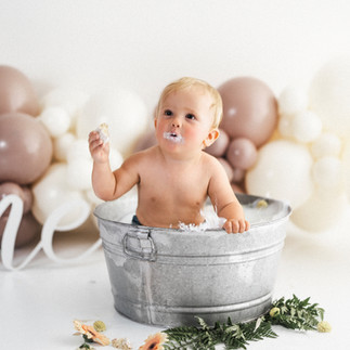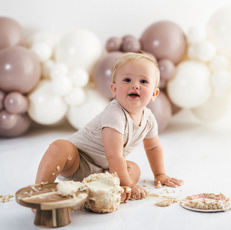 We began with milestone portraits — August exploring, playing, and showing off his sweet personality. The balloon backdrop made the perfect frame, both fun and sophisticated. Then came the cake smash, where August dove in with curiosity and delight. Hug’s and Kisses Bakeshop outdid themselves with a cake that looked beautiful and tasted even better — August definitely approved.